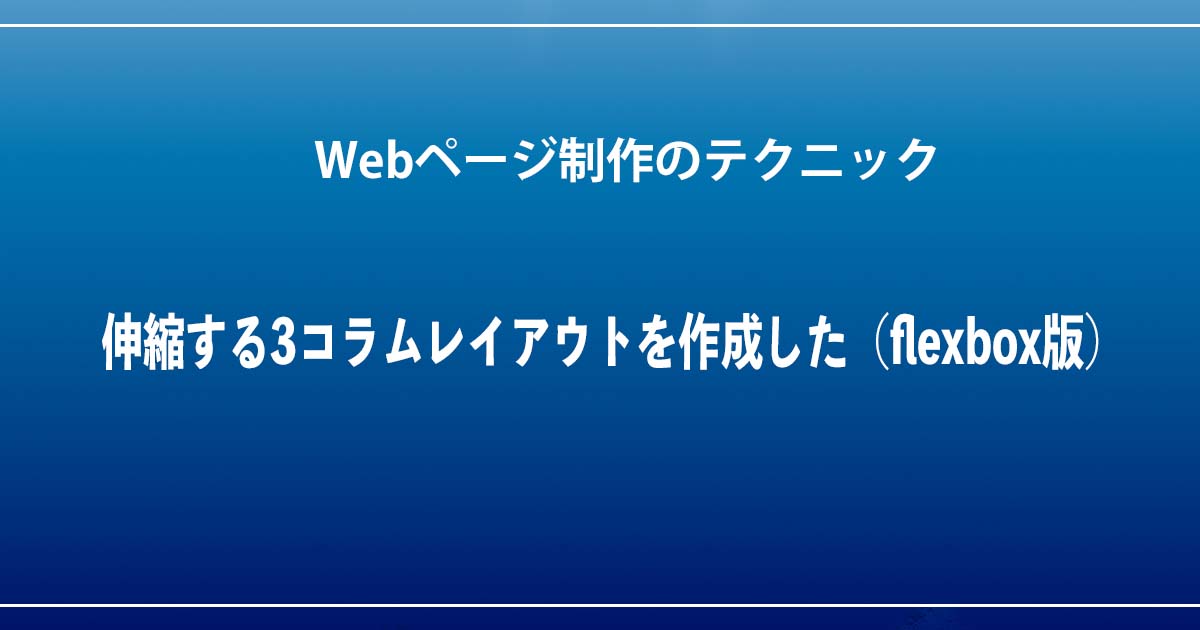 フレックスボックスを使ってメインコンテンツの領域とサイドバーを横に並べます。伸縮するコラムレイアウトでは、通常はメインコンテンツの領域だけを伸縮させ、サイドバーの幅は固定します。フレックスボックスでこの動作を実現するには、メインコンテンツの領域のCSSには「flex:1 1 auto;」を、サイドバーのCSSには「flex: 0 0 300px」というように設定します。サイドバーに設定する「ベースサイズ」には、サイドバーの幅を指定します。フレックスボックスを使った伸縮する2コラムレイアウトは、フロートに比べてHTMLが少しだけ単純になります。