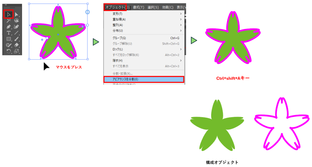 「選択ツール」で星を選択します。メニューの「オブジェクト」→「アピアランスの分割」を選択すると、複数の独立したオブジェクトに分割されます。Ctrl+shift+Aキーを押して選択を解除します。