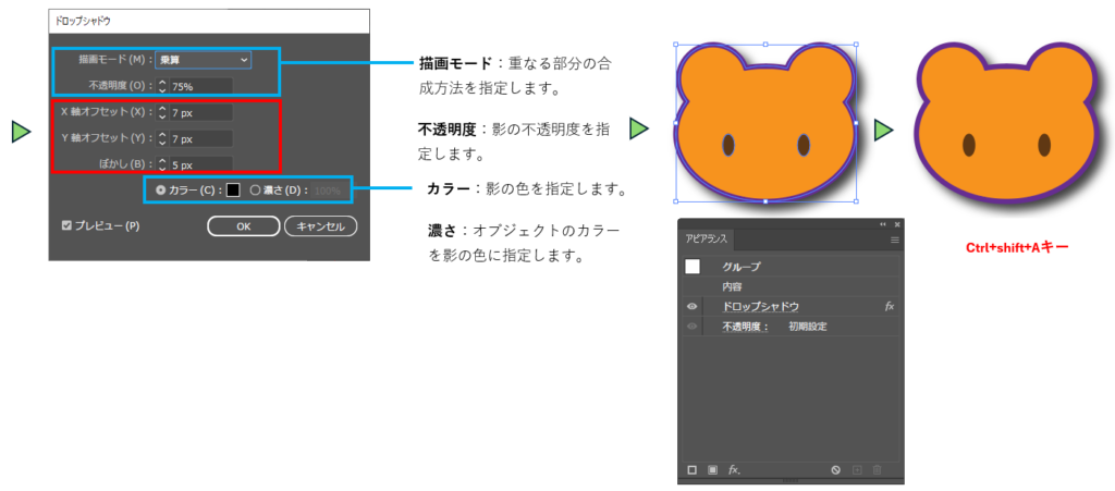 2、「ドロップシャドウ」ダイアログボックスが表示されますので、X軸オフセット「7」pt、Y軸オフセット「7」pt、ぼかし「5」ptにします。「OK」ボタンを押すと、傘のオブジェクトに対し影が作成されます。Ctrl+shift+Aキーを押して選択を解除します。