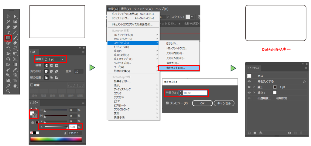 「長方形ツール」で長方形を描画し、線パネルの線幅を「1」pt、カラーパネルの線を「K=100」%にします。メニューの「効果」→「スタイライズ」→「角を丸くする」を選択します。「角を丸くする」ダイアログボックスが表示されますので、角丸の半径を「10」ptにします。「OK」ボタンを押すと、オブジェクトの角が丸くなります。Ctrl+shift+Aキーを押して選択を解除します。