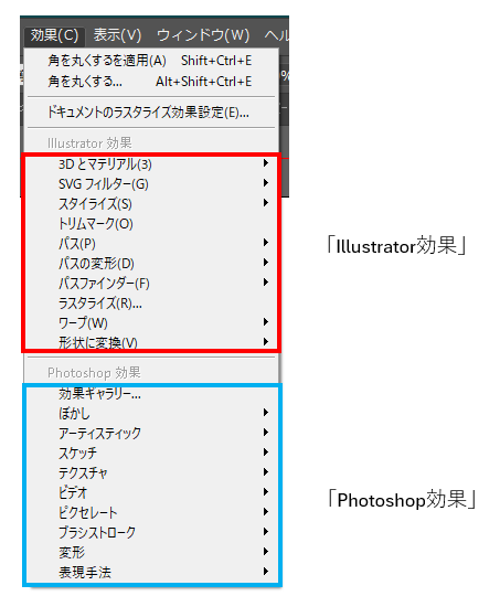 Illustratorの効果メニューには、「Illustrator効果」と「Photoshop効果」の2つがあります。どちらも元の形状を保持したまま、見た目だけを変更しますが、効果を表現する処理方法が異なります。「Illustrator効果」は、主にベクタ形式の効果を適用し、アピアランス分割後はパスを保持します。