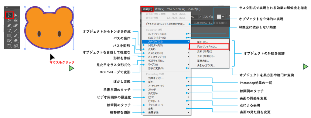 1、「選択ツール」で傘を選択します。メニューの「効果」→「スタイライズ」→「ドロップシャドウ」を選択します。