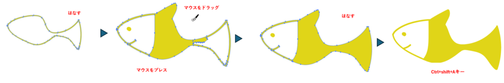 「鉛筆ツール」を選択し、画面上でマウスボタンをプレスします。円を描くようにドラッグします。始点部分に近づくと、ツール形状が変化しますので、そのままマウスボタンをはなし、始点と終点を接続します。Ctrl+shift+Aキーを押して選択を解除します。