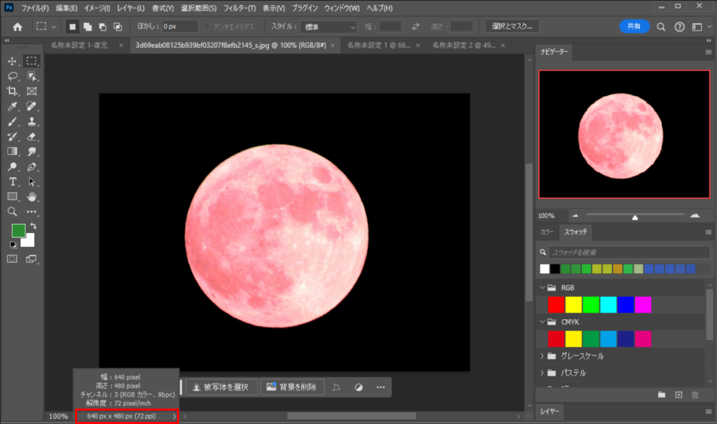 現在開いている画像のピクセル数(画素数)と解像度はウィンドウの下部にある「ステータスバー」をクリックする表示されます。ピクセル数は幅×高さで表示されます。一般的にWeb用の画像などモニタに表示するための画像解像度は、使用する画像サイズで72ppi、印刷用の画像解像度は、使用するサイズで350ppiに設定します。