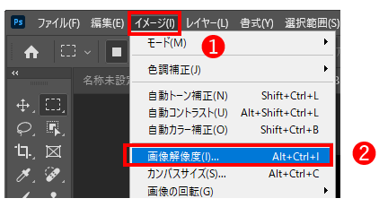 メニューのイメージ(❶)→画像解像度(❷)をクリックします。