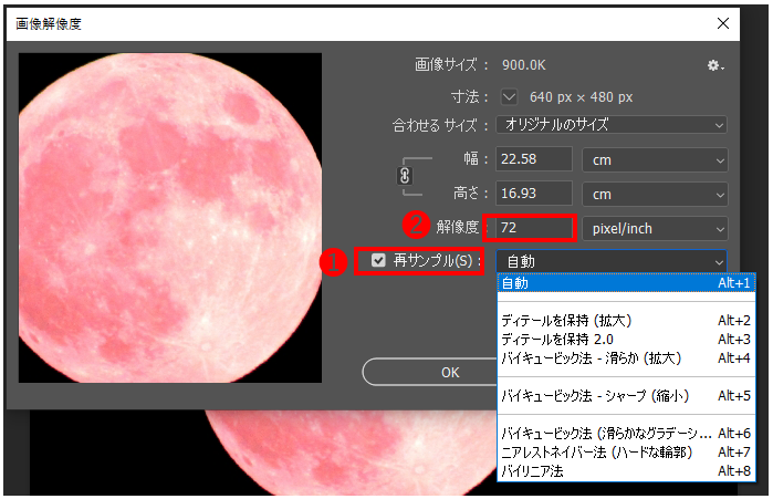 再サンプル(❶)をチェックします。解像度(❷)に数値を入力してOKボタンをクリックします。
