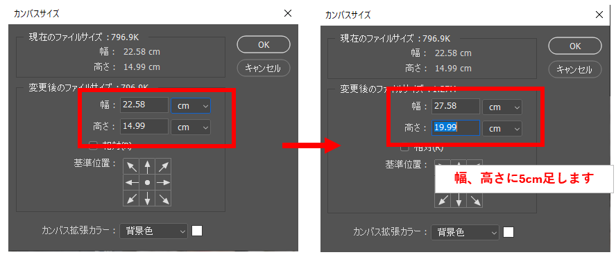 相対にチェックを入れて、幅と高さを増やしたい数値を入力して「OK」ボタンをクリックすると画像の周りに余白が作成されます。「幅」「高さ」にマイナスの値を入力するとカンバスサイズから引かれます。その際は画像の一部が切り取られます。