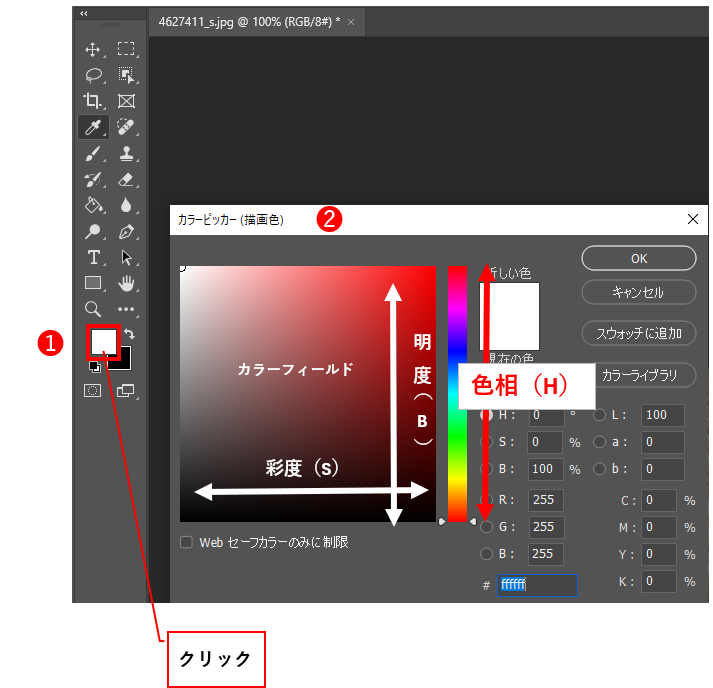 1、ツールパネルの下部の「描画色を設定」(または、「背景色を設定」)❶をクリックすると、「カラーピッカー(描画色)」(または、「カラーピッカー(背景色)」)ダイアログボックス❷が表示されます。