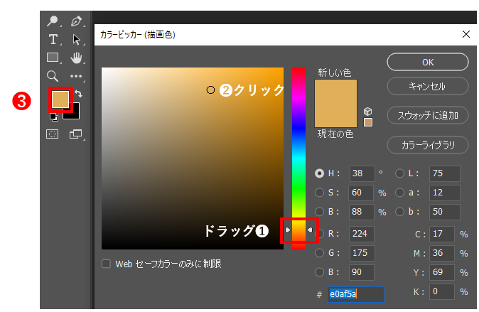 2、カラーバーのスライダーをドラッグして色相を選択し(❶)、カラーフィールドで目的の色をクリックして選択します(❷)。「OK」ボタンをクリックすると「描画色と設定」(または、「背景色を設定」)に新しい色が適用されます(➌)。