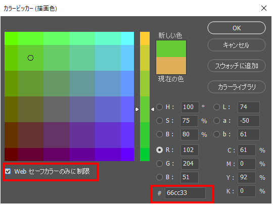 Webセーフカラーのみを使用して画像を作成すると、Webブラウザでは正確に色を表示されます。「カラーピッカー(描画色)」ダイアログボックスの左下部にある「Webセーフカラーのみに制限」にチェックを入れると、Webセーフカラーになります。