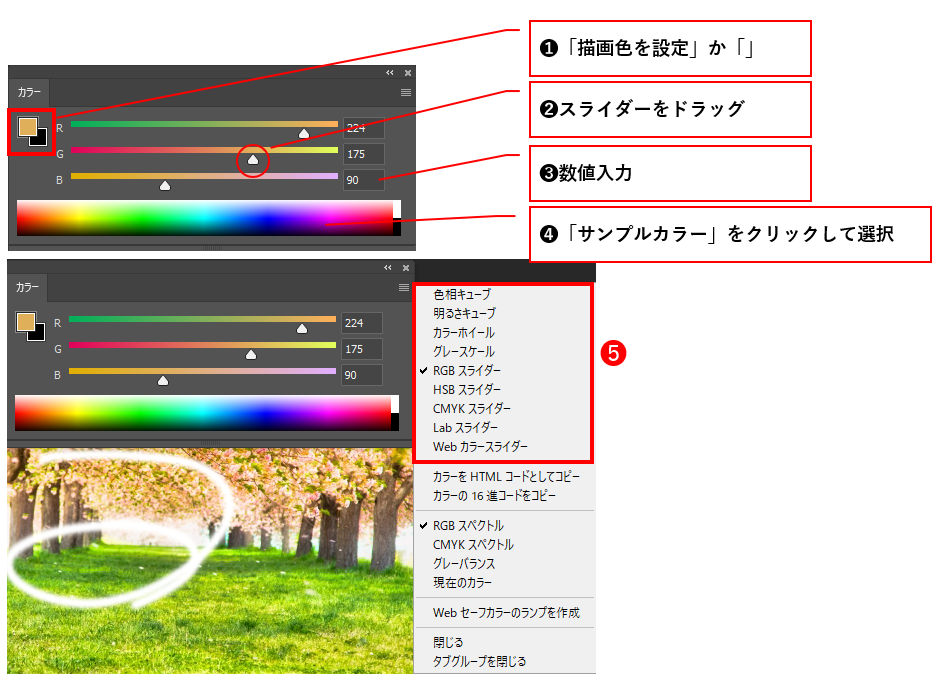 メニューの「ウィンドウ」の「カラー」を選択して表示される「カラー」パネルでも、描画色と背景色を設定できます。「カラー」パネルの「描画色を設定」か「背景色を設定」のどちらか設定したいほうを選択肢、スライダーをドラッグしたり、テキストフィールドに数値を入力したり、サンプルカラーで色を設定します。パネルメニューから、色を設定するスライダーのカラーモードを選択して切り替えることができます。