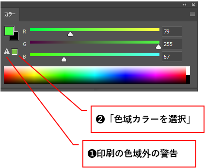 「カラー」パネルで色を選択した際も、CMYKモードで正確に印刷できない色の場合は三角形の警告マークが表示されます(❶)。警告マークか「色域カラーを選択」アイコンをクリックすると(❷)、CMYKモードで表示できる近似色に置き換わります。