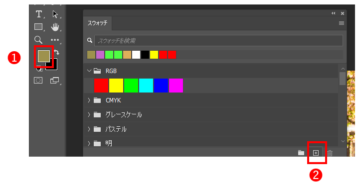 1、描画色に色を設定してから(❶)、「スウォッチ」パネルの「描画色から新規スウォッチを作成」ボタン(❷)をクリックします。