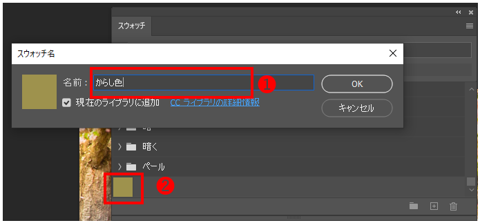 2、「スウォッチ名」ダイアログボックスが表示されるので、任意の名前を入力して(❶)「OK」ボタンをクリックすると、その色がスウォッチとして新たに登録されます(❷)。