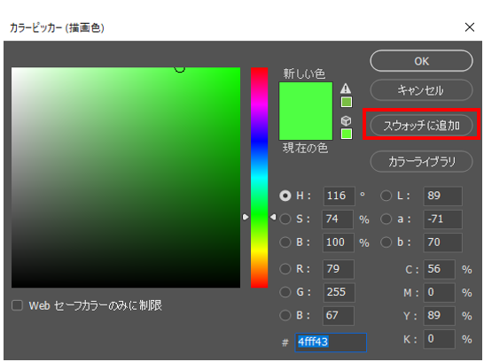 「カラーピッカー」ダイアログボックスの「スウォッチに追加」ボタンからも、設定中の色を名前をつけてスウォッチに登録することができます。