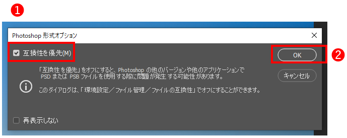 「環境設定」→ダイアログボックスで「ファイル管理」を左クリックします。ファイル管理画面の「PSDおよびPSBファイルの互換性を優先」を常にオンに設定すると表示されなくなります。