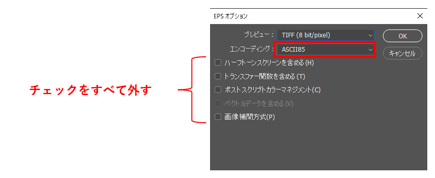 「EPSオプション」ダイアログが表示されます。チェックをすべて外し、エンコーディングをASCII85に設定してOKボタンをクリックするとPhotoshopEPS形式として保存されます。