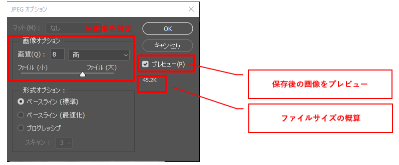 「JPEGオプション」ダイアログボックスが表示されるので、「画像オプション」で圧縮率を設定し、「OK」ボタンをクリックするとJPEG形式として保存されます。