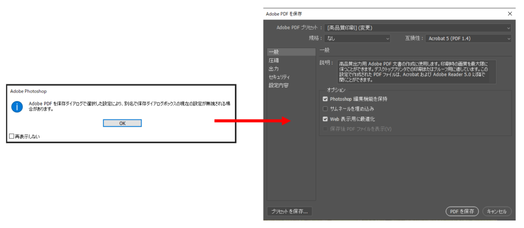 「Photoshop編集機能を保持」にチェックが入っていると、「以前のバージョンのPhotoshopと互換がありません。」というダイアログボックスが表示されますが「はい」をクリックします。