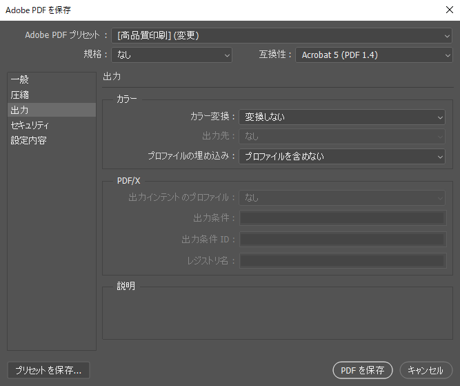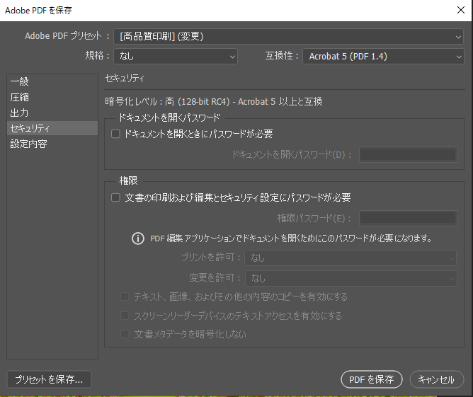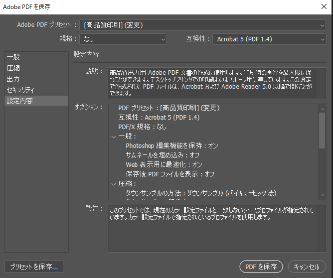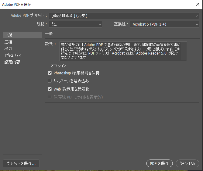 「Adobe PDFを保存」ダイアログボックスが表示されます。印刷出力用には「Adobe PDFプリセット」を「高品質印刷」に設定して、「PDFを保存」ボタンをクリックするとPhotoshopPDF形式として保存されます。