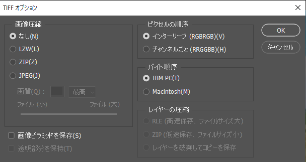 「TIFFオプション」ダイアログボックスが表示されるので、「画像圧縮」は「なし」を選択し「OK」ボタンをクリックすると、TIFF形式として保存されます。