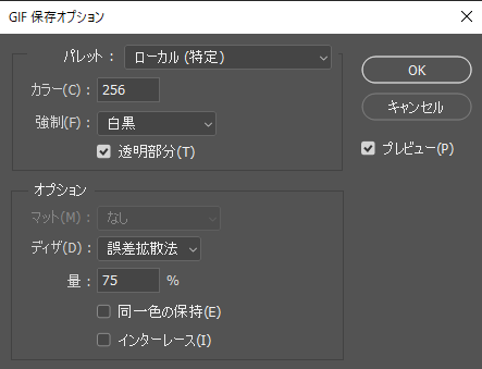 GIFはインターネットで主に用いれられている画像形式です。RGBだが「インデックスカラー」という色数が限られたファイルだ。最大で256色しか使用できず、ディザ処理をして階調を疑似的に再現するために、写真などの表現には適さない。