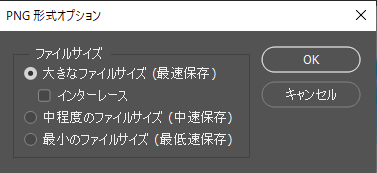 クリッピングパスや透明をサポートした画像形式で、可逆圧縮による劣化のない画質とコンパクトなファイル容量が特徴。「別名で保存」を選んだ場合は、画像のインターレースのみを設定することになるが、「書き出し」から実行した場合は、サイズ、拡大・縮小、再サインプル、カンバスサイズなどが設定できる。