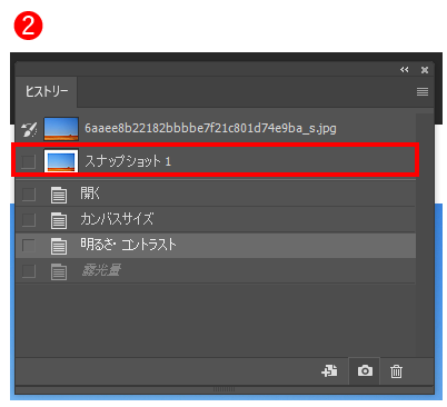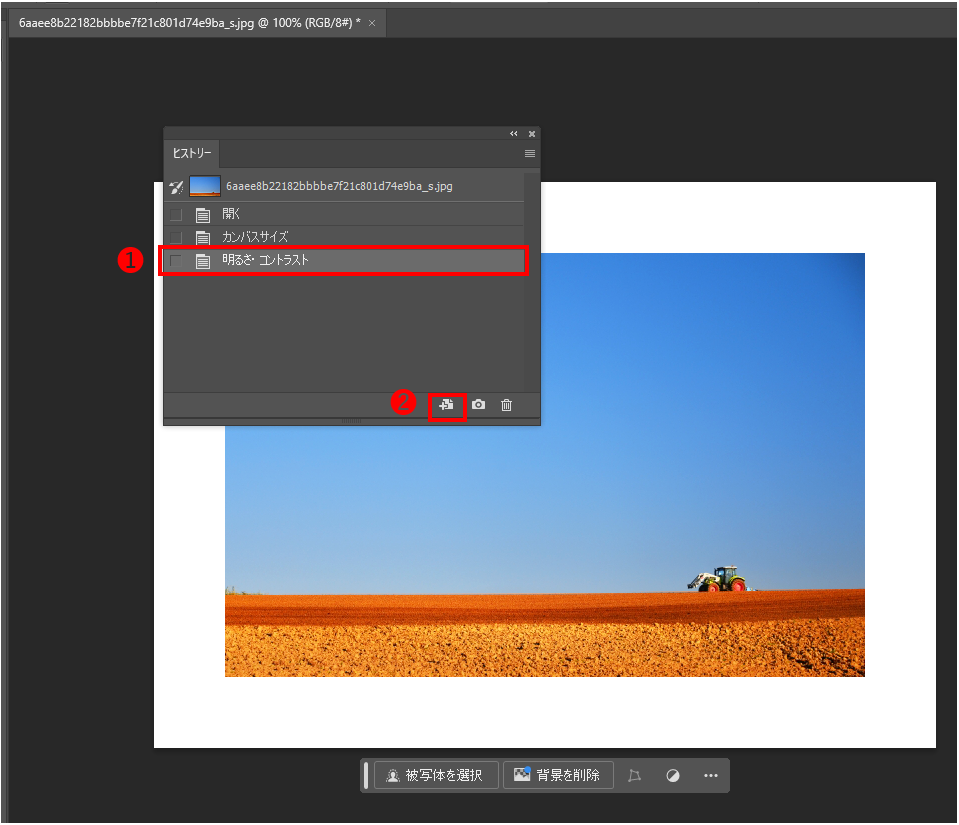 ヒストリーパネルで、任意のヒストリーを選択(❶)して「現在のヒストリー画像から新規ファイルを作成」ボタン(❷)をクリックすると、選択したヒストリー内容の新規画像が作成できます。