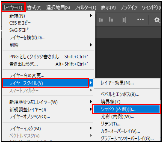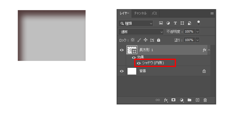 2、「レイヤー」パネルで「長方形1」を選択し、「レイヤー」メニューの「レイヤースタイル」→「シャドウ(内側)」を選択します。