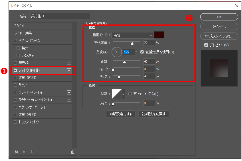 3、「シャドウ(内側)」が選択された状態で(❶)「レイヤースタイル」ダイアログボックスが表示されます。「シャドウのカラーを設定」「距離」「サイズ」「不透明度」「角度」を設定して影を作ります(❷)。「チョーク」はシャドウの「スプレット」にあたります。