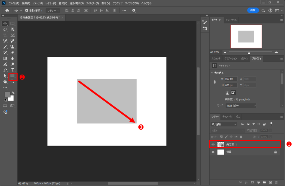 1、背景を白で新規ファイルをRGBモードで作成します。新規レイヤーを作成し(❶)、「長方形選択」ツールを選択し(❷)、斜めにドラッグして画面中央に長方形の選択範囲を作成し(➌)、25%のグレーで塗りつぶします。