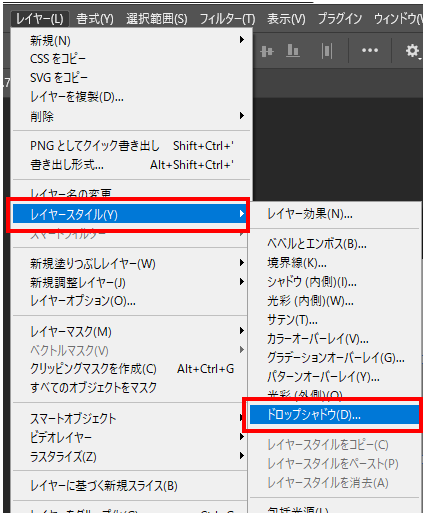 2、「レイヤー」パネルで「レイヤー1」を選択し、「レイヤー」メニューの「レイヤースタイル」→「ドロップシャドウ」を選択します。