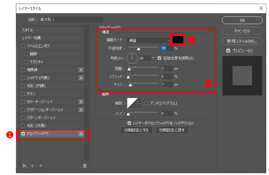 3、「ドロップシャドウ」が選択された状態で(❶)「レイヤースタイル」ダイアログボックスが表示されます。ここで「シャドウのカラーを設定」、「不透明度」、「角度」、「距離」、「スプレット」、「サイズ」を設定して影を作ります(❷)。これらの操作は数値を入力するか、スライダーで調整します。まずは「シャドウのカラーを設定」をクリックして色を設定します(➌)。