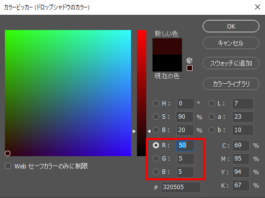 4、「カラーピッカー(ドロップシャドウのカラー)」ダイアログボックスが表示されます。※RGBにそれぞれ、R「50」、G「5」、B「5」と数値を入力して「OK」をクリックします。影の色が変わります。