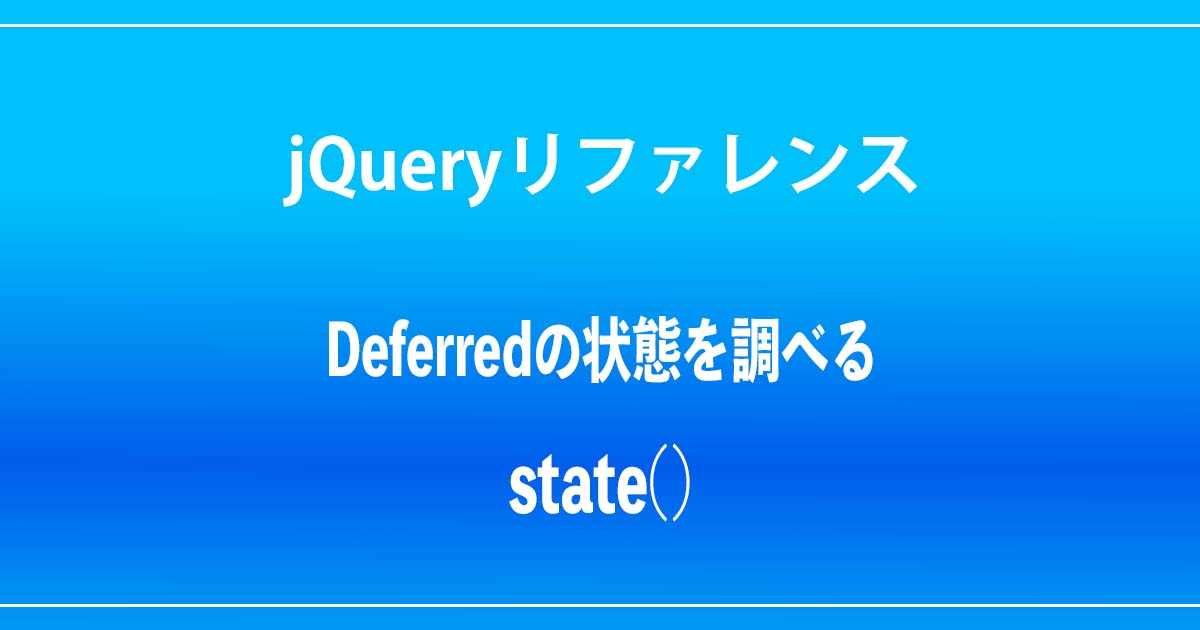 Deferredオブジェクトの状態を調べます。pending、resolved、rejectedのいずれかを返します。デバック時などに有用なメソッドです。書式dfd.state()var dfd = $.Deferred();var state = dfd.state();サンプルDeferedオブジェクトの状態を取得して出力する<body> <div class="main"> <div cla...
